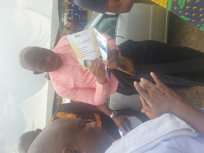 A man in a pink shirt holds a booklet with "Contents" listed and writes with an orange marker. He stands near a silver car and a white tent. Other people are visible, including one with a towel draped over their shoulder and another with a patterned cloth. The scene appears to be outdoors, with grass visible.