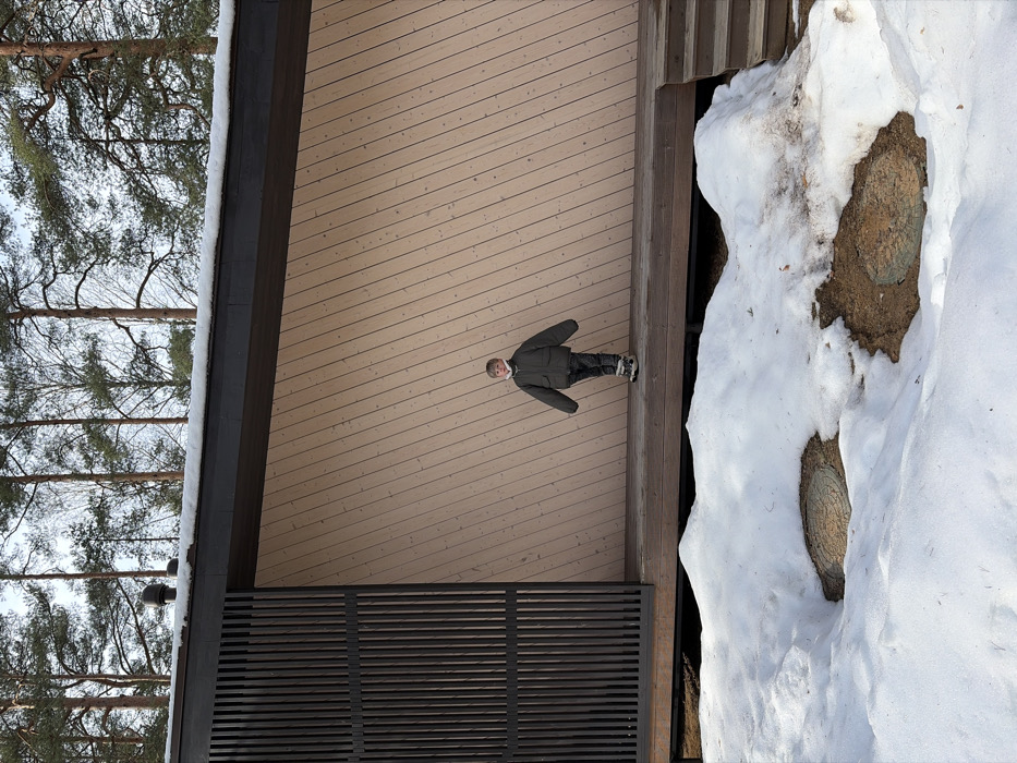 The image displays an outdoor scene in Kerro, Russia, during what appears to be winter or early spring. A young child stands centrally on a light brown wooden deck, positioned in front of a modern building. The child, appearing male and approximately 5-7 years old, is dressed in a bulky, dark olive green winter jacket, dark patterned trousers, and grey and white winter boots. He has short, light-colored hair and faces the camera directly with a neutral expression. His arms are slightly extended from his body due to the thickness of his jacket. Behind the child, the building's exterior wall features two distinct sections. The left portion consists of dark brown vertical wooden slats, while the larger right portion is clad with light-colored wooden panels arranged diagonally upwards from left to right. The building's dark-colored roofline is visible above, covered with a thin layer of snow, and two dark vent pipes are present on the roof's left side. In the foreground, below the wooden deck, the ground shows patches of melting snow interspersed with exposed brown earth or dirt. Two circular, patterned metal manhole covers are partially visible within these exposed areas. A short flight of three wooden steps descends from the right side of the deck to the ground level. The background features a dense forest of tall, slender trees, primarily evergreens, beneath a pale, bright sky.