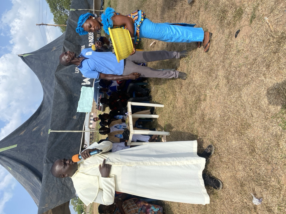 This image captures an outdoor gathering in Itobe, Nigeria, under a bright sky with scattered clouds. The scene is set on dry, light brown grassy ground, with a large, dark-colored tarp or canopy providing shade in the background. In the foreground, three primary figures are visible. On the left, a man wearing a long, off-white clerical robe with a cape-like collar holds an orange and blue microphone to his mouth with his right hand, while his left hand gestures forward. He wears dark shoes. Centrally, another man stands, dressed in a blue short-sleeved polo shirt, grey trousers, and dark closed-toe shoes. He holds a small, yellow cylindrical object, possibly a secondary microphone or an item for display, in his right hand. To the right, a woman stands facing left, wearing a blue headwrap, a multicolored patterned top with ruffled blue sleeves, and a long, light blue skirt. She holds a bright yellow plastic woven basket at waist level with both hands. She wears dark flat sandals. Behind these individuals, beneath the dark canopy, several people are seated on chairs, forming an audience. A white rectangular table is positioned near the seated group, holding plastic water bottles and a white plate with light-colored items. In the far background, visible under the clear sky, are unpaved ground, distant low-rise buildings, a dark vehicle, and sparse vegetation.