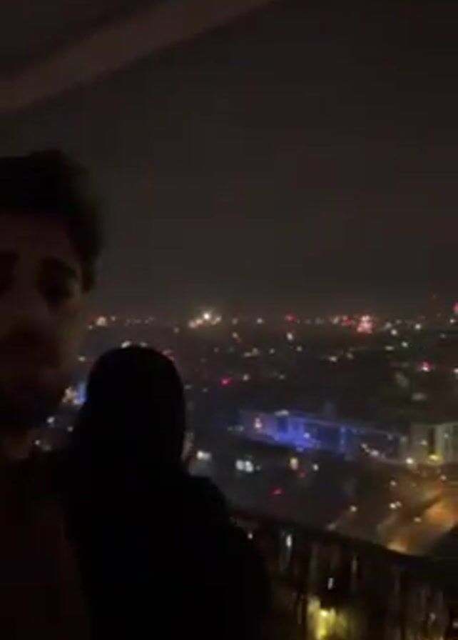 man standing on a high balcony at night. City lights are visible in the background, with fireworks exploding in the distance. Another person is standing next to him, also looking out at the view. The balcony has a wooden railing. The man appears to be recording a video of himself with the city and fireworks as a backdrop.