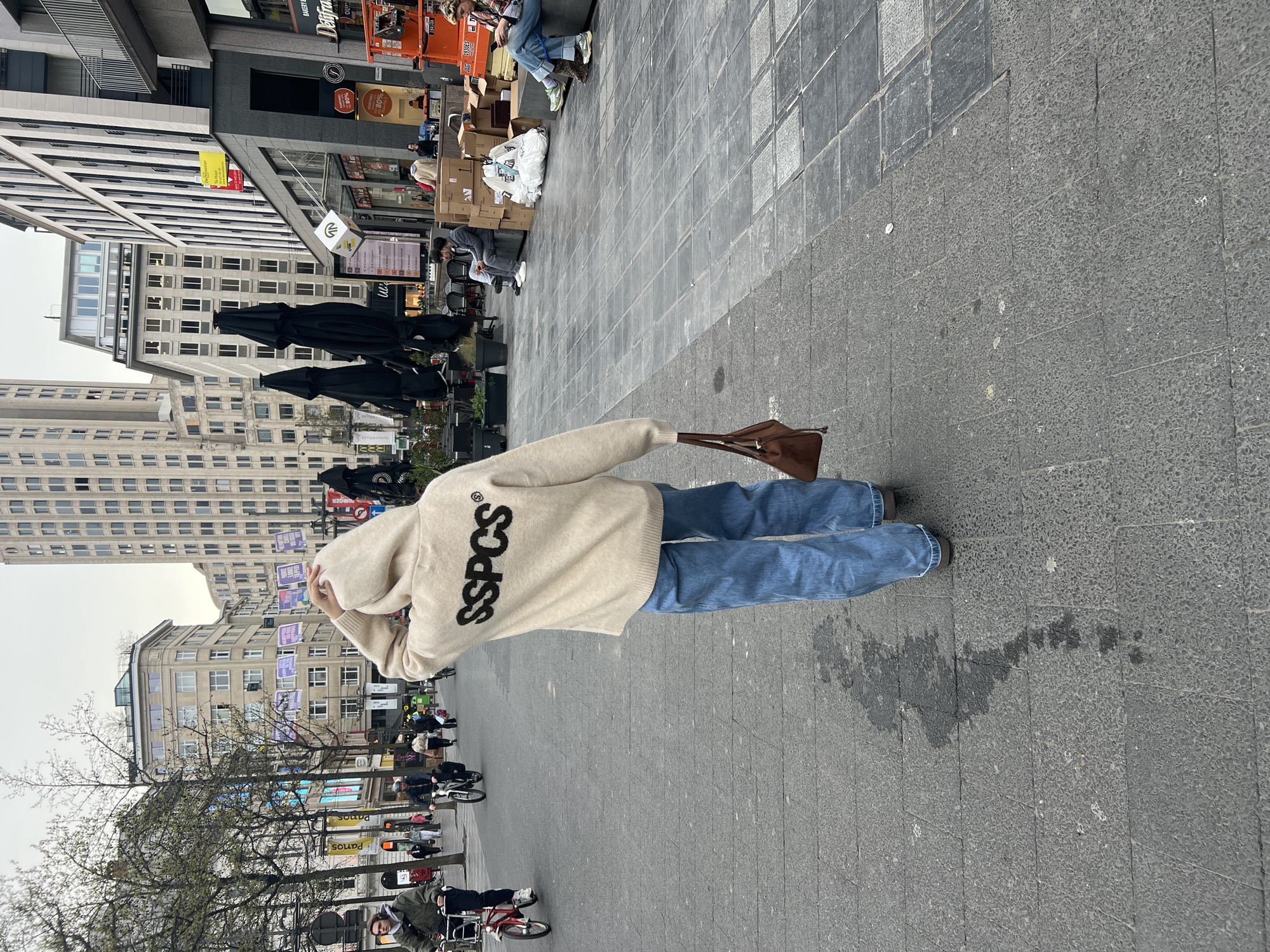 The scene depicts a pedestrian shopping street, identified as the Meir in Antwerp, Belgium, with the prominent Boerentoren (KBC Tower) visible in the background. A person is walking away from the camera in the immediate foreground, dressed in a light beige hooded sweatshirt with "SSPCS" embroidered in black on the back, light blue loose-fitting jeans, and brown shoes. The person's left hand is raised, touching the back of their head or adjusting the hood, while a small brown handbag is held in their right hand. The street is paved with dark grey rectangular and square tiles, featuring a distinct, elongated dark stain on the pavement near the subject's feet. To the left, a man on a red bicycle with a front basket is cycling towards the camera, followed by another cyclist. Several pedestrians are walking further down the street. Bare trees with sparse foliage line the left side of the thoroughfare. On the right side of the image, an outdoor seating area with multiple black, folded umbrellas and tables is visible in front of a commercial establishment identified as "Delifrance." Two men are seated on a low concrete barrier or planter, with one wearing a grey hoodie and the other a dark jacket, surrounded by stacked cardboard boxes. Further to the right, a partial view of an orange mobile lift is visible, beside which another person is seated, engaged with a mobile phone. Building facades line both sides of the street, displaying signs such as "Panos" and "De Meester," along with various promotional banners hanging across the street. The sky above is overcast.