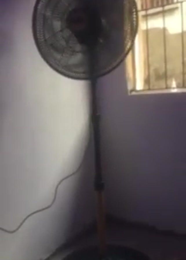 dark-colored standing fan in a room. The fan has a round base and a cylindrical stand with a dark upper portion and a wooden-colored lower portion. The fan head is enclosed in a protective grill. A black power cord is visible, trailing from the fan to the side. The fan is positioned in a corner next to a window. The walls of the room are light-colored. The video is slightly blurry. The fan is not in motion.