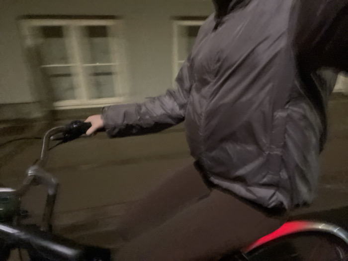 The image displays a person actively riding a bicycle at night in Copenhagen, Denmark. The individual, seen from the waist up in profile, wears a dark grey horizontally-quilted puffer jacket and dark brown trousers. Their right hand is firmly grasping the right handlebar of the bicycle. The bicycle is equipped with an illuminated red rear light, clearly visible on its fender. In the blurred background, a light-colored building wall is present, featuring two distinct windows with light-colored frames, through which interior light is visible. The scene exhibits motion blur, consistent with movement through an urban environment.