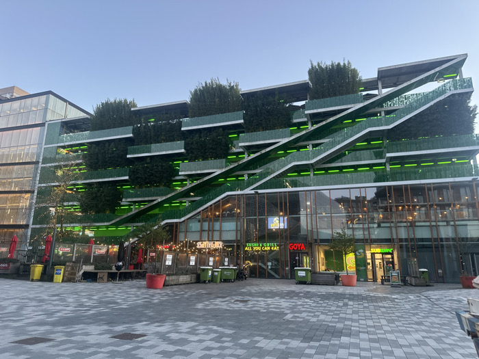 This image depicts a multi-story building in Nieuwegein, Netherlands, featuring a distinctive green, vegetated facade and ground-level commercial establishments, fronted by a paved pedestrian plaza
