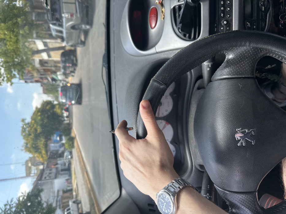 Inside a car, the driver holds a lit cigarette. The dashboard and steering wheel are visible, featuring a Peugeot logo. A silver watch adorns the driver's wrist. Outside, traffic flows on a city street lined with trees and buildings under a sunny sky.