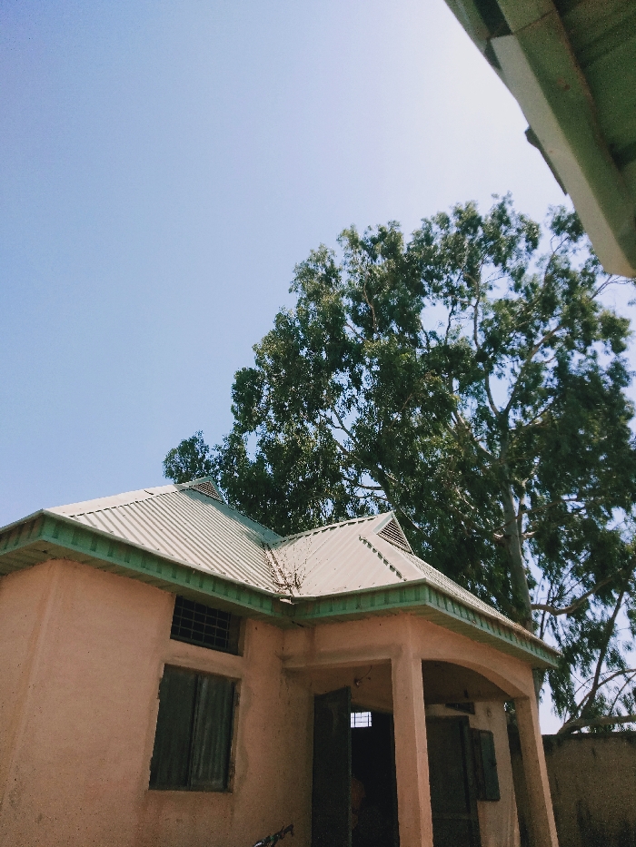 A low-angle shot shows a one-story building with a tan exterior, a corrugated metal roof with green trim, and two visible windows. One window has bars. An open doorway leads into a shadowed interior. The building has a small covered porch supported by pillars. A large tree with dense green foliage towers behind and to the right of the building, reaching high into a bright blue sky. Part of another building with green trim is visible in the upper right corner of the frame.