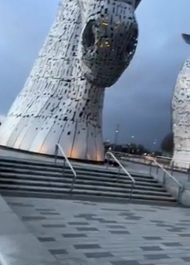 low-angle pan up to reveal two large horse head sculptures made of silver-colored metal panels. The sculptures are set against a dark, cloudy sky. There are concrete steps leading up to the sculptures, with metal railings on either side. The ground around the sculptures is paved with gray and black patterned stones. There are streetlights in the background.