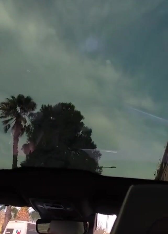 The view from inside a car on a street. A palm tree is visible beyond the windshield and sunroof. The sky is light blue with some clouds. A white service van is in front of the car. A driver is visible in the reflection in the rearview mirror. The interior of the car is black and grey. The sky is visible through the sunroof. The car is moving slowly on the street.