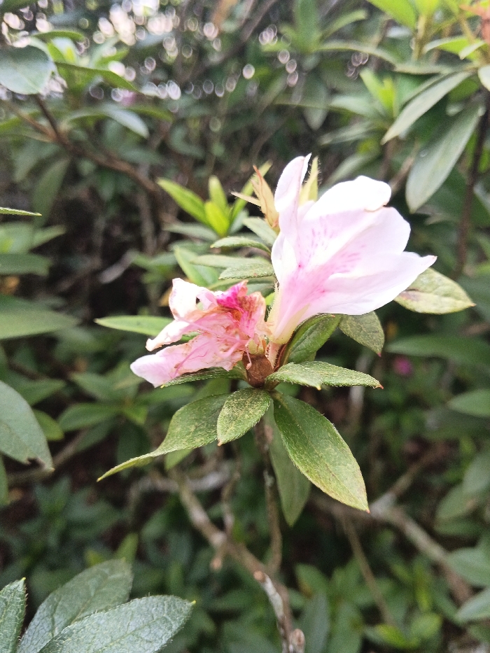 This image displays two flowers growing on a plant with green foliage, situated in the city of Bangalum Bridge, Papua New Guinea. The flower on the right is largely intact, presenting light pink petals with subtle darker pink striations and a trumpet-like form. The adjacent flower on the left appears withered and damaged, with its petals crumpled and discolored to a darker, more intense pink, particularly at its base. The plant features multiple ovate green leaves, some exhibiting minor yellowing or dust-like specks. The background consists of dense, blurred green foliage, indicative of an outdoor, vegetated environment. No individuals or specific actions are visible within the frame.
