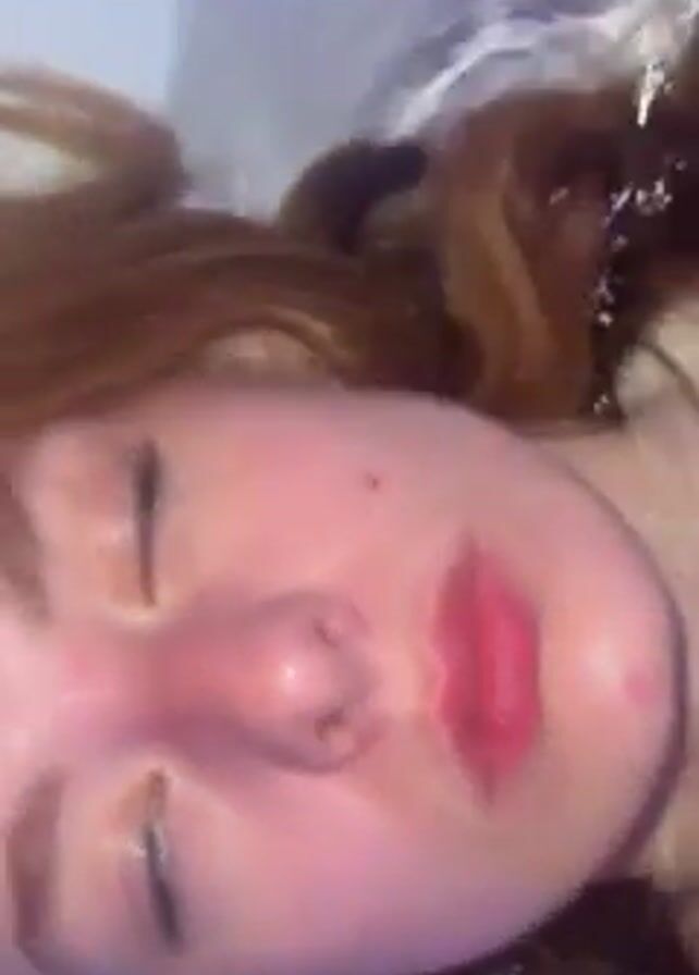 person lying in a tub of water, immersing their face and hair. The person is light-skinned with red hair and fair-colored eyes. Their face is wet and has visible freckles or spots on the nose. They are wearing lip gloss or lipstick. Water flows over the person’s face and hair as they submerge themselves and come back up. The background is white, possibly the interior of a bathtub. The lighting is somewhat dim, contributing to a soft, almost ethereal quality of the image.