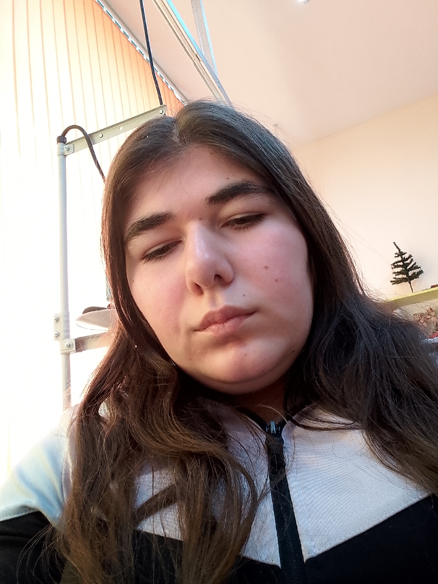 A close-up, self-portrait style photograph depicts a young female, positioned centrally and looking downwards. She has long, dark brown hair parted in the middle, extending over her shoulders and chest. Her eyes are mostly closed or cast down, with closed lips forming a slight pout. Her skin tone is light to medium, with some visible redness on her cheeks and a few small moles/freckles on her right cheek. She is wearing a garment with a partially unzipped black zipper on the front, featuring a light grey or white textured fabric collar and upper chest area, contrasting with a black section below. The background on the left is brightly illuminated, revealing light orange or beige vertical blinds and a metallic structural pole with horizontal crossbars secured by bolts, around which a dark cable is partially visible. The background on the right consists of a plain, light-colored wall, with a small, dark green artificial Christmas tree ornament situated on a shelf or surface. Other indistinct objects are partially visible below the tree. The lighting suggests a strong light source from the left, creating a warm glow on the subject's face. The precise location within Popovo, Bulgaria, cannot be determined from the visual evidence.