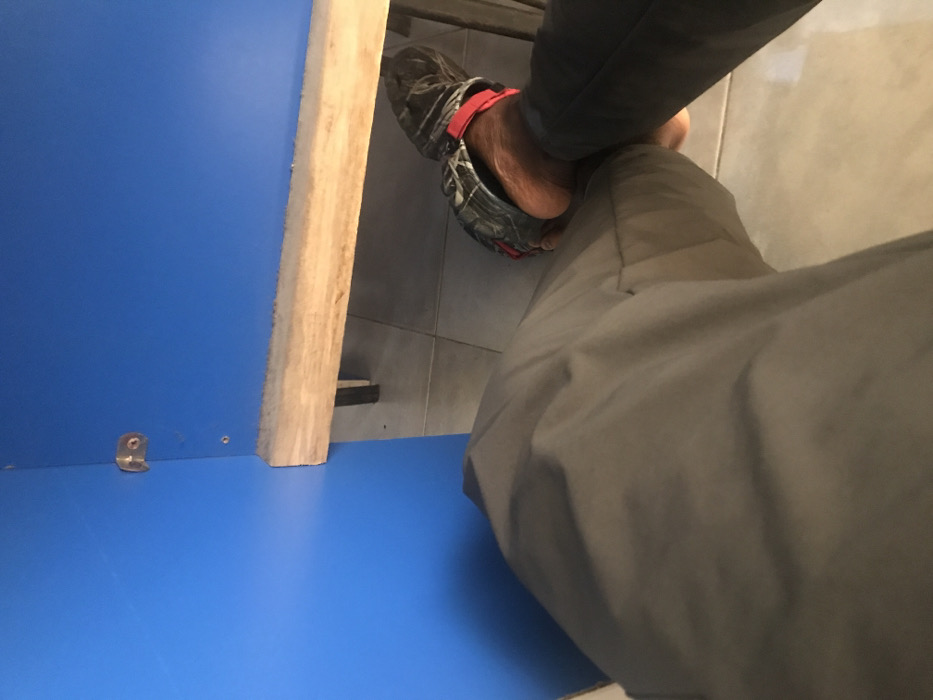 The scene depicts the lower body of an individual from a first-person perspective, situated indoors in Calabar, Nigeria. The individual wears light-colored (possibly khaki or light brown) trousers on the left leg, which extends towards the bottom left of the frame. The right leg, further from the viewer, is clad in dark trousers and a camouflaged-patterned open-toed slipper or sandal featuring a prominent red strap across the instep. The individual's bare foot is visible within the slipper. In the upper half of the frame, a segment of a blue-colored structure, likely a desk or counter, is visible. This structure features a horizontal light-brown wooden trim or panel running along its lower edge. On the left side of the blue surface, a silver-colored metal bracket or fastening is affixed. The floor beneath the blue structure and the individual's right leg consists of light-colored, square-tiled flooring. A dark, possibly metal, furniture leg is visible on the tiled floor under the blue structure. No explicit interactions are evident beyond the individual occupying the space.