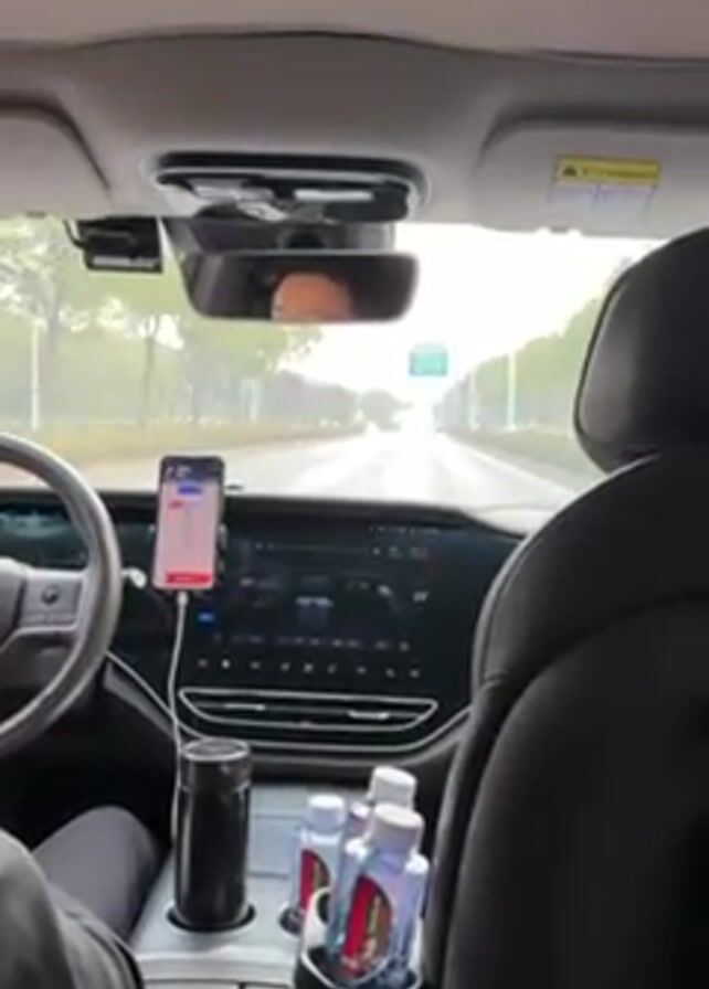 The camera is inside a vehicle traveling on a road with white lane markings, captured from a passenger seat perspective. Trees line both sides of the road under an overcast sky. The rear-view mirror reflects the face of the driver, but only the eyes and forehead are visible. The car is approaching an overpass with road signs displaying directions to various zones including the "Resorts Zone" and "Middle Ring Rd". In the foreground, the car's interior is visible, showing the dashboard with a digital display, a smartphone mounted on a holder, and a center console containing a stainless steel tumbler and two bottles of water.