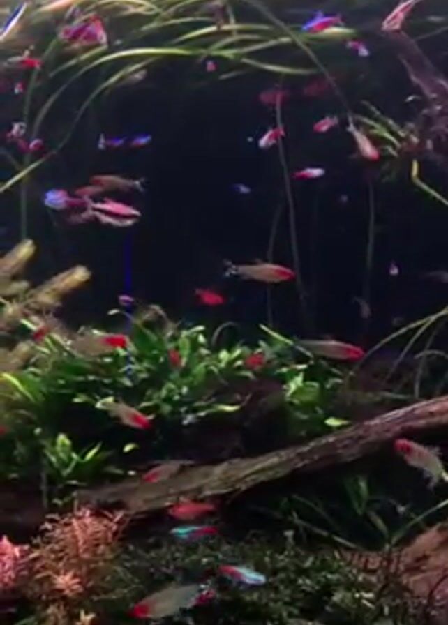 n aquarium filled with numerous small, colorful fish swimming amongst aquatic plants and driftwood. Some of the fish are bright red, while others have neon blue stripes. The plants vary in color and texture, with green, reddish, and brown hues. The background is dark, giving the aquarium a moody and immersive feel. The fish are actively swimming, creating a dynamic and lively scene.