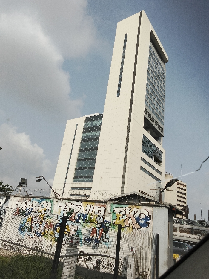 The image depicts an urban scene in Itirin, Nigeria. A tall, modern, light-colored skyscraper dominates the background, featuring multiple levels of reflective glass windows and stark vertical architectural lines. To its left, a shorter, wider structure of similar design is partially visible. In the midground, a substantial concrete wall, approximately head-height, is covered extensively with multicolored graffiti, primarily stylized text in various bright hues. This wall is topped with multiple strands of barbed wire, with some sections also featuring small, dark, angled streetlights or security fixtures. A dark, wire-mesh fence stands in front of the wall, further obstructing the view of the lower section. To the right of the concrete wall, a small, light-colored utility shed-like structure is visible. The sky above is partially cloudy, displaying both clear blue patches and diffused white cloud formations. No discernible people, explicit actions, or direct interactions are visible within the frame.