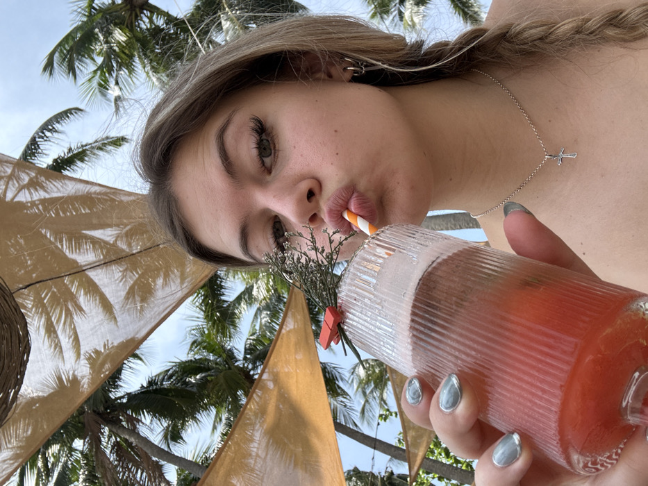- "A close-up, eye-level selfie captures a young Caucasian female outdoors in an apparent resort or beach club setting in Thành phố Phan Thiết, Vietnam, under a bright, partly cloudy sky with visible palm trees and tan fabric shade structures overhead" by FM-sKB6l1, licensed under CC BY 4.0