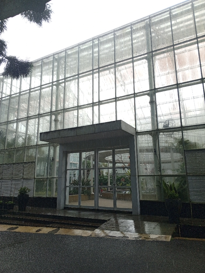 A large glass building stands with a covered entrance featuring double doors. Rain streaks across the glass, obscuring the view inside. The building's facade is structured with a grid-like pattern. Plants are visible inside and potted plants flank the entrance. Wet pavement reflects light and the overcast sky hints at a rainy day. Tree branches overhang the top of the frame.