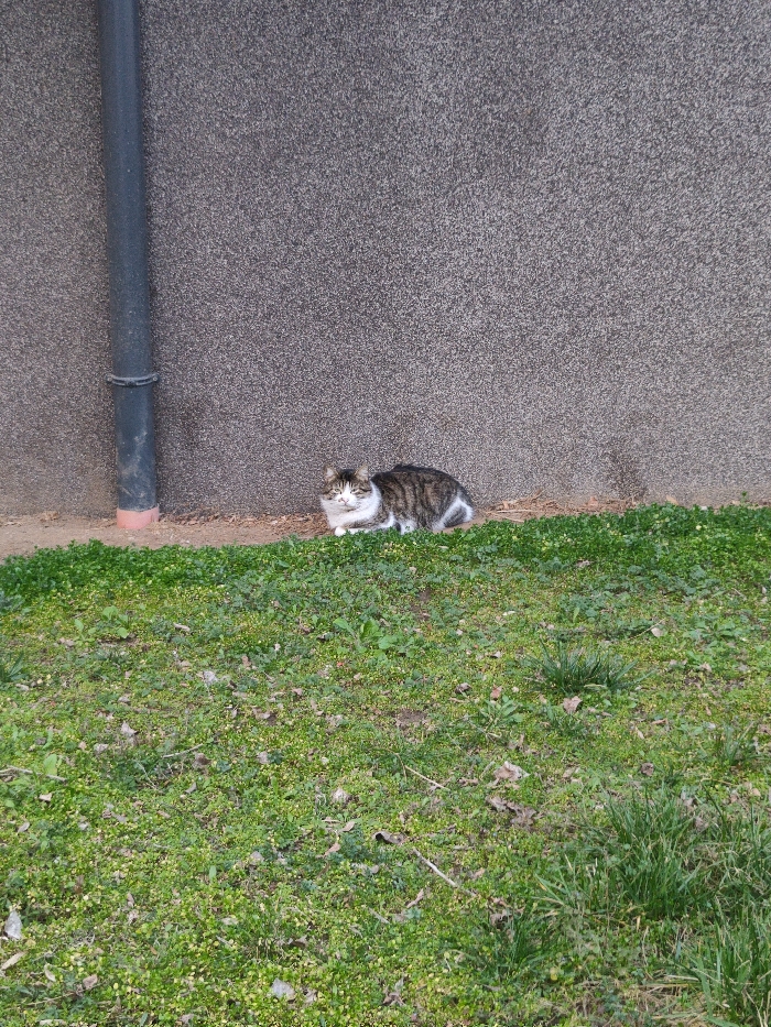 - "The image displays a bi-color tabby cat, featuring brown and grey stripes with prominent white fur on its face, chest, belly, and paws, resting on a narrow strip of bare earth at the base of a textured, grey-brown wall in Sofia, Bulgaria" by FM-DY5YU2, licensed under CC BY 4.0