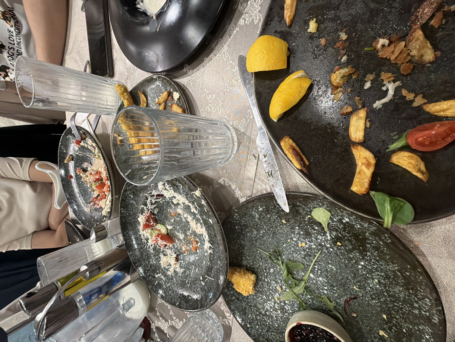 A dining table in a restaurant in Baldevo, Bulgaria, is depicted post-meal, viewed from an elevated perspective