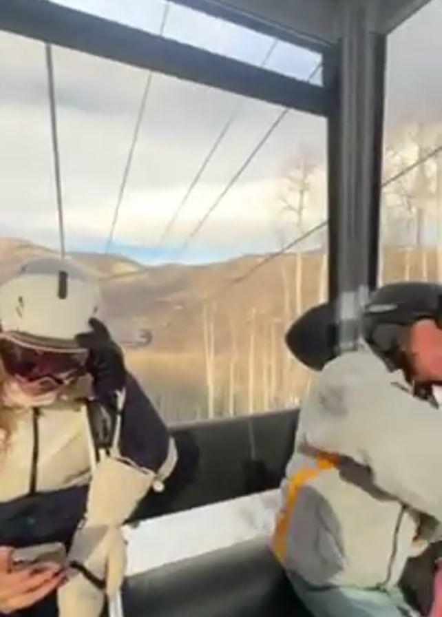 view from a gondola, a type of cable car, ascending a snow-covered mountain. Inside the gondola are three people: two women and one man. All are wearing ski or snowboarding attire, including helmets and goggles. One woman is looking at her phone, and the other woman gestures out the window towards the snowy, tree-covered landscape. The man sits quietly, looking out the window. The scenery consists of snow, trees (mostly aspens with white trunks), and a partially cloudy sky. Other gondolas are visible further up the cable line.