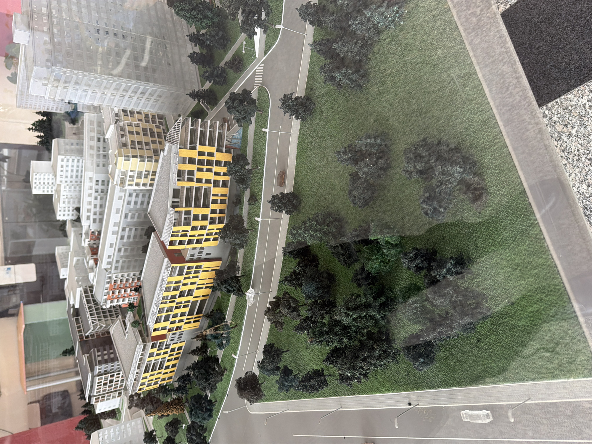 A physical architectural scale model, depicting a proposed urban development in Varna, Bulgaria, is presented from an elevated perspective. The model showcases a cluster of multi-story residential buildings, prominently featuring structures with yellow and dark grey facades and numerous rectangular windows. A tall, translucent white high-rise building dominates the right side of the model, accompanied by several other white and grey residential blocks. The urban environment is integrated with extensive green landscaping, textured to represent grass, and densely populated with numerous miniature dark green trees and scattered shrubs. A network of dark grey roads with white lane markings and sidewalks runs through the development, illuminated by miniature streetlights. White guardrails border some road sections. A translucent white car and a brown car are positioned on the roads. Small human figures are visible on sidewalks and within green areas, providing a sense of scale. A small blue water feature is located adjacent to one of the yellow-facade buildings. The entire model is viewed through a reflective transparent cover, causing minor glare.