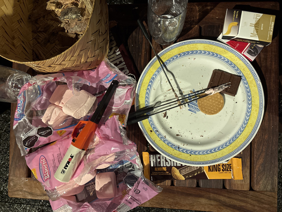 This image depicts a wooden slatted table in Huasca de Ocampo, Mexico, laden with items suggesting a recent s'mores preparation or consumption activity