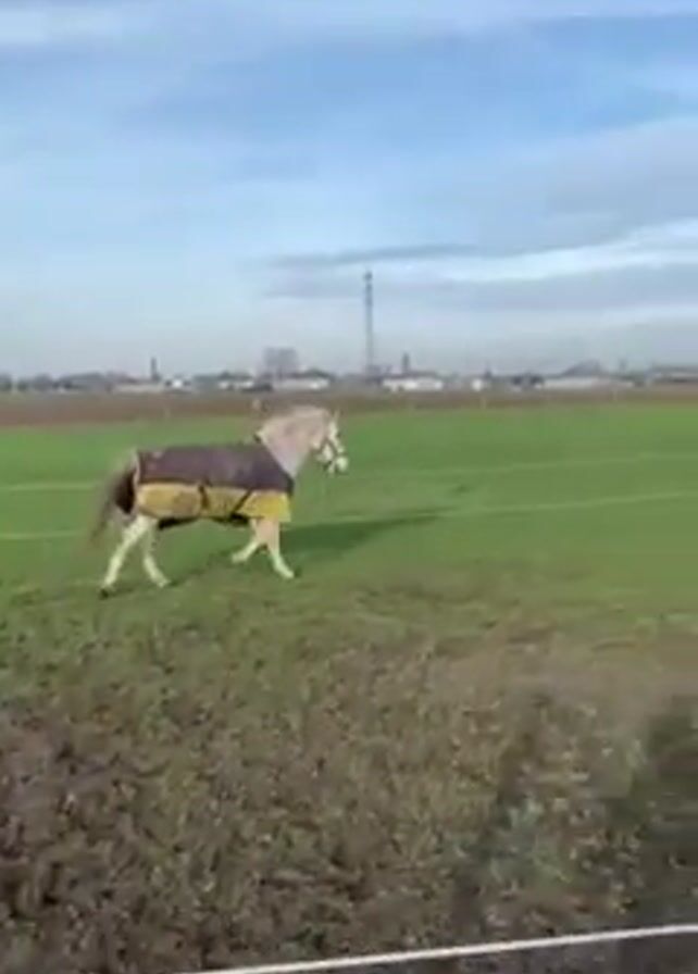 - "small white horse wearing a brown and yellow blanket, trotting in a grassy field" by FM-xTDQG2, licensed under CC BY 4.0
