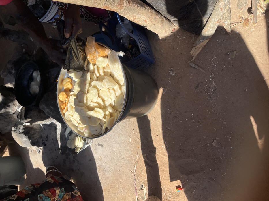 The image depicts an outdoor food preparation and vending scene in Vodni, Nigeria