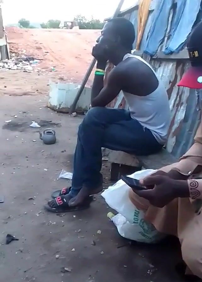 Two dark-skinned men are sitting outside. One man is seated on a wooden stool, dressed in a white tank top and jeans, with his arm resting on his knee. He is looking off into the distance, appearing contemplative. The second man, wearing a tan robe and a cap with "T-M" printed on it, is seated on the ground and is focused on a smartphone. A white plastic bag is on the ground in front of him. Behind them is a weathered corrugated metal structure, with a piece of blue fabric hanging from it. An old kettle sits on the ground nearby. The area appears to be somewhat dirty, with trash and debris scattered around. In the background, a dirt hill can be seen.