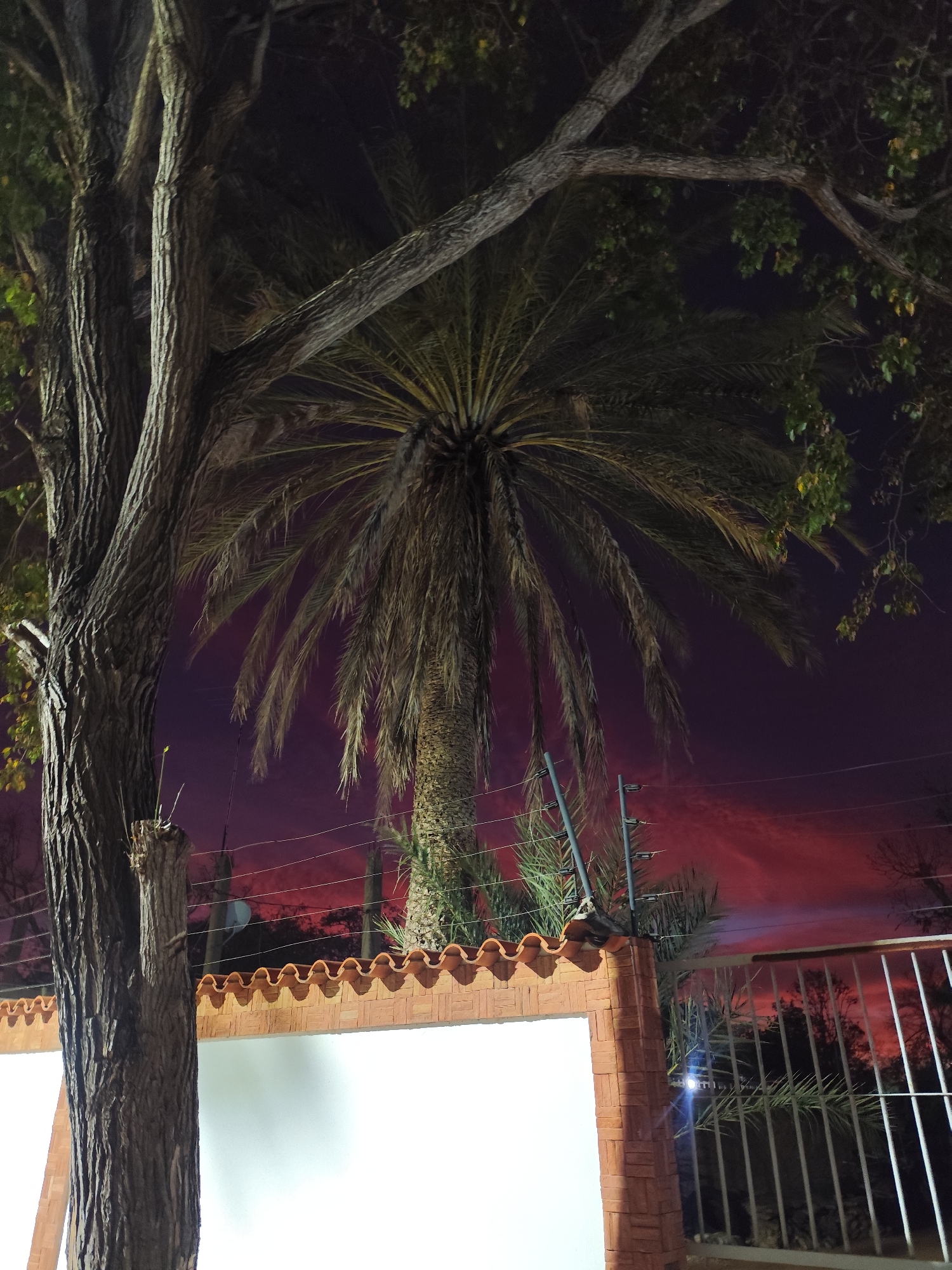 The image depicts a nighttime outdoor scene in Las Hernández, Venezuela. The sky transitions from a dark indigo hue directly overhead to a fiery red-orange on the distant horizon. A large, mature tree with textured bark occupies the left side of the foreground, its primary trunk extending vertically and a thick branch crossing diagonally through the upper mid-section. Sparse green foliage is visible on some branches. Behind the foreground tree and a security wall, a tall palm tree with extensive fronds is centrally positioned, silhouetted against the sky. A perimeter wall runs across the mid-ground, featuring a lower, smooth, light-colored plastered section and an upper segment constructed from reddish-brown bricks. A decorative coping of terracotta-colored, wave-patterned roof tiles tops the brickwork. Above the wall, an electric fence system is visible, comprising multiple horizontal wires supported by several grey insulators. To the far right, a dark, vertical-bar metal gate is partially open, and a small, bright light source is present near its structure. A small, light-colored satellite dish is discernible in the distance, positioned above the wall and below the reddish sky. No individuals are present in the frame.