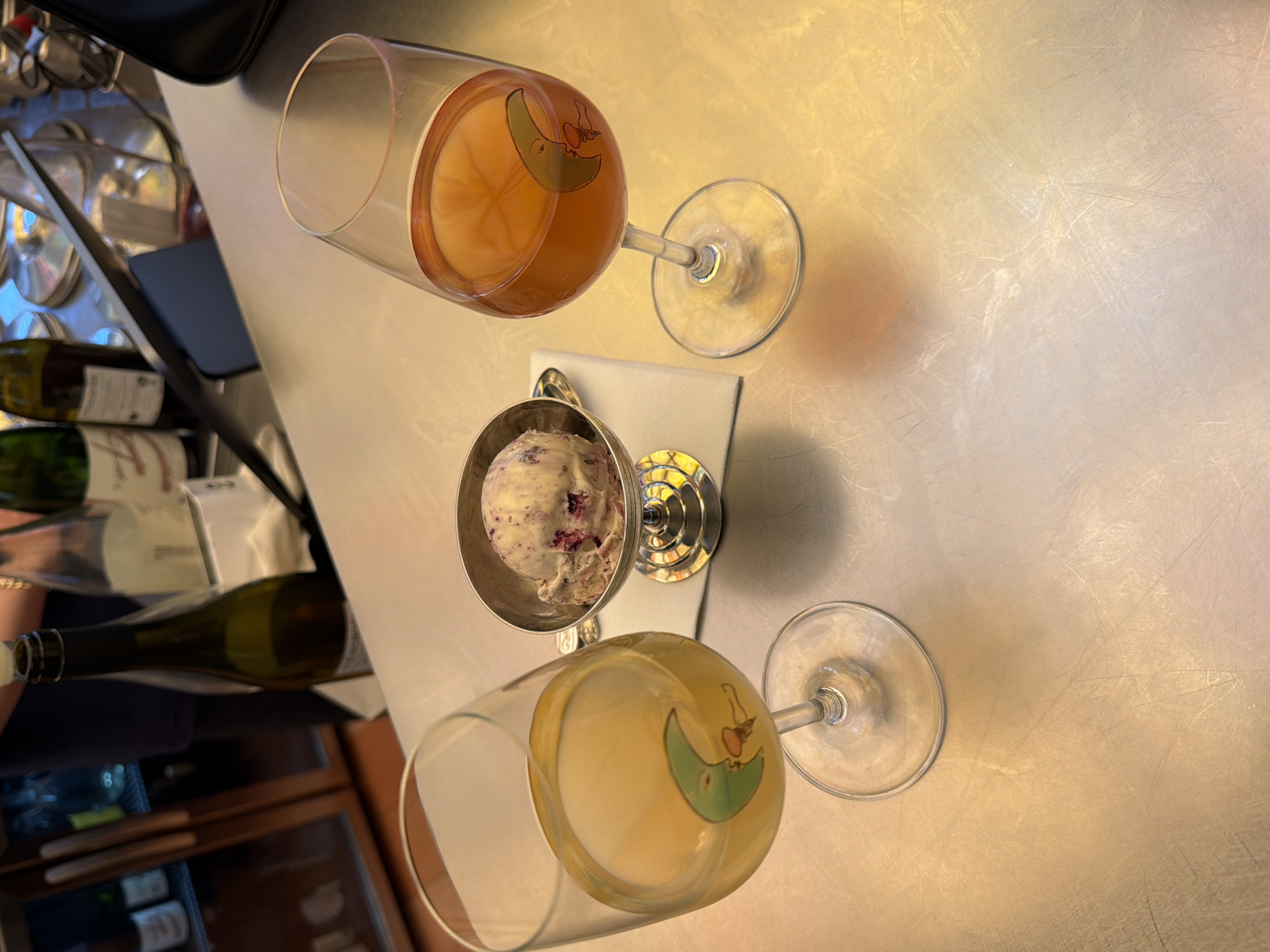The image is a close-up, high-angle shot of a table setting with two wine glasses, a serving of ice cream, and bottles of wine. The glasses are decorated with a cartoon moon character. One glass contains a yellow liquid, possibly white wine, and the other an amber liquid, possibly rosé or orange wine. The ice cream is served in a metal cup, possibly a silver-plated dessert dish, with a napkin placed beside it. Wine bottles are visible in the lower-left corner, implying a restaurant or bar setting. The countertop surface is stainless steel. The location is possibly a high-end restaurant or bar in London, United Kingdom, based on the wine selection and tableware. No people are visible.