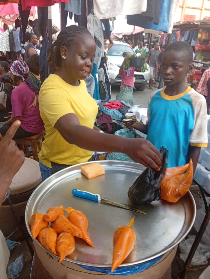 A woman in a yellow shirt is selling food from a tray to a boy in a blue shirt at an outdoor market. The food appears to be orange, cone-shaped items in plastic bags. There is a knife and a square of food on the tray. The background is filled with other people, clothing for sale, and a parked car.