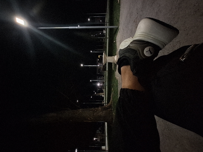The image depicts a nighttime scene in a public park or square within the city of Dolni Chiflik, Bulgaria. In the foreground, the lower half of a person's left leg is visible, clad in dark trousers and a black and white athletic shoe featuring a prominent white Puma logo on the side. The leg is bent at the knee, with the foot elevated. The midground features a paved pathway or ground surface. To the left, a large, dark tree trunk is prominent, indicating mature foliage beyond the frame. Scattered across the scene are multiple modern streetlights with rectangular LED fixtures, emitting bright white light that creates visible light rays, especially from the streetlight on the far right. In the center-right midground, a light-colored, ornate stone structure, possibly a bird bath or a decorative pedestal, stands on a grassy patch. Further back, additional streetlights illuminate parts of the park, revealing benches and what appears to be a well-maintained urban green space. The overall environment is dark, illuminated solely by the artificial light sources. No other individuals are discernibly present.