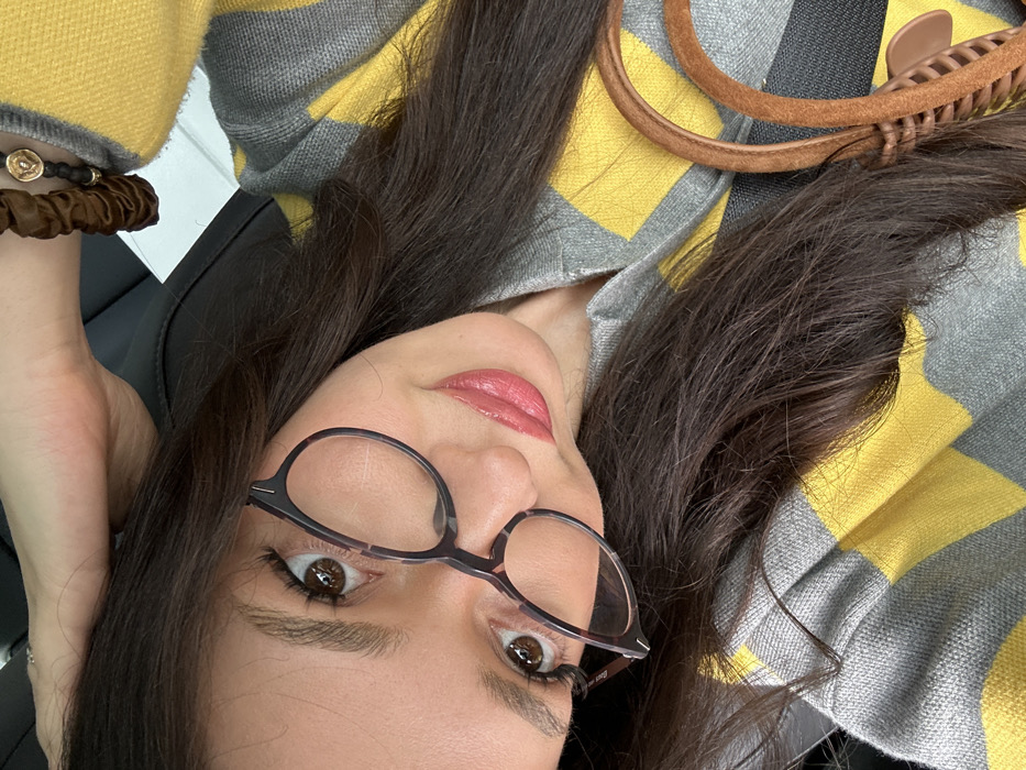 A close-up, angled portrait depicts a female individual within what appears to be the interior of a vehicle. Her head is tilted, and her brown eyes, framed by dark-rimmed eyeglasses, engage directly with the camera. She has long, dark brown hair, visible eyelashes, arched eyebrows, and wears light pink lipstick. Her upper body is clad in a garment featuring a repeating pattern of grey and yellow geometric shapes. Her right arm is raised, with a portion of her hand visible behind her head. Adorning her right wrist are two accessories: a brown fabric scrunchie and a beaded bracelet with a gold circular charm. A large, brown, claw-style hair clip is positioned on the lower right side of the image, resting against her clothing. The background shows dark, possibly leather, upholstery, consistent with a car seat or interior. No specific environmental details are present in the image to identify its location within Glendale, United States.