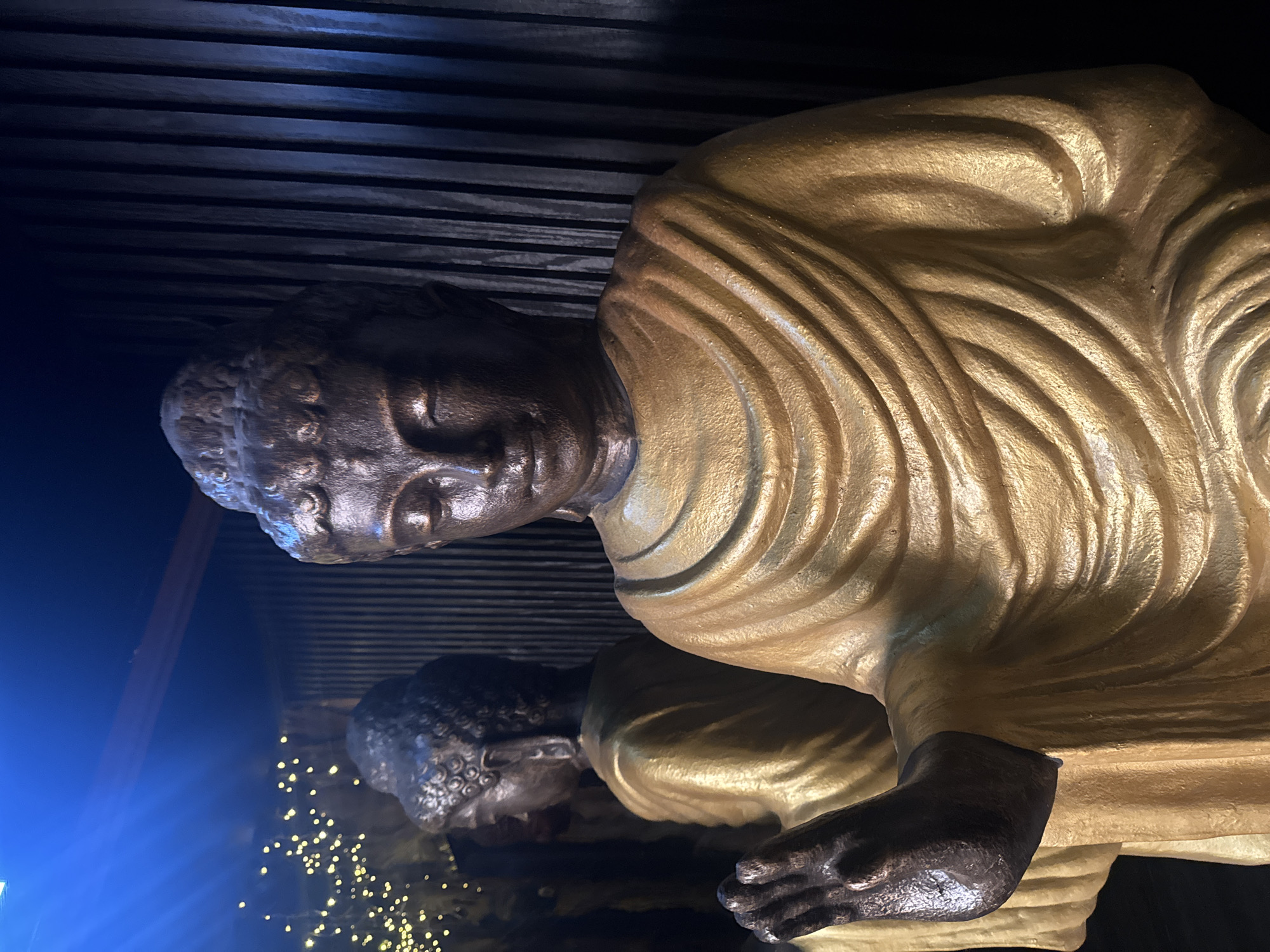 - "A bronze-colored Buddha statue with a gold robe is displayed indoors under a dark wood slat ceiling" by FM-YyqJq1, licensed under CC BY 4.0