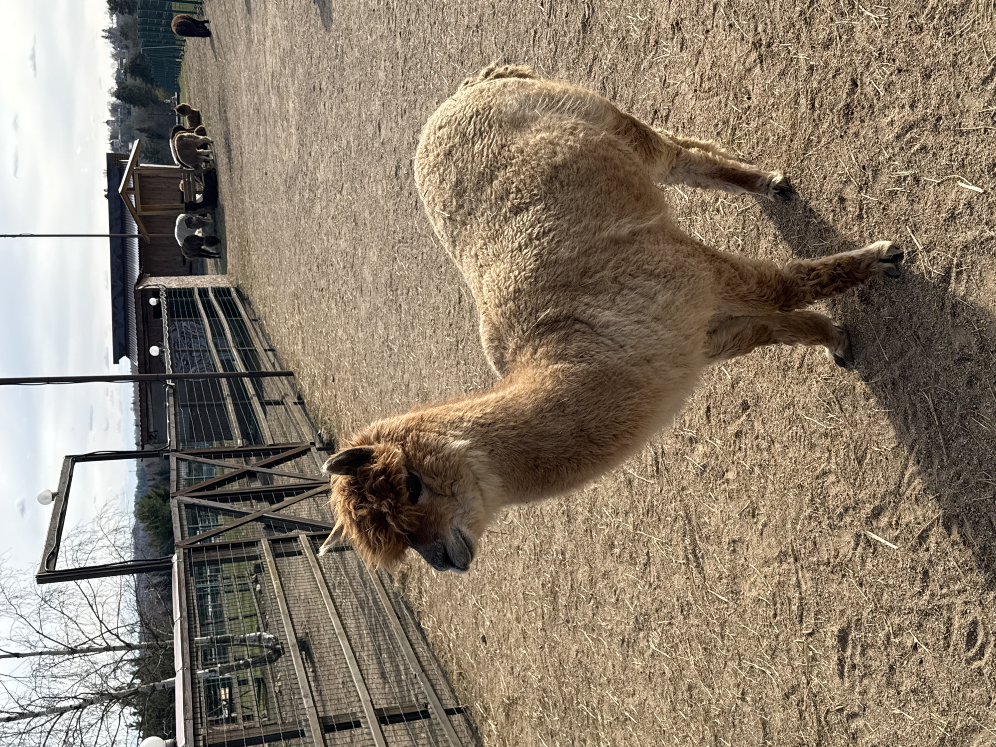 A tan alpaca lies on a dirt surface in an enclosure. Behind the alpaca is a fence made of wooden posts and metal bars. Behind the fence is a grassy area with trees. In the distance, there is a building and other animals. The scene is located in Pokhodkino, Russia.