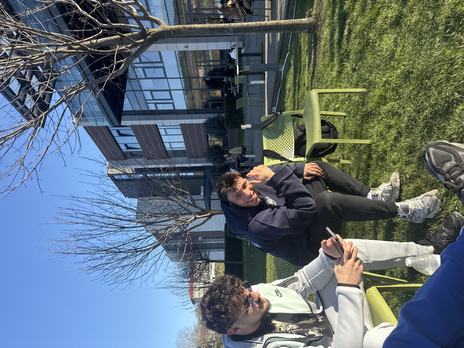 The image depicts an outdoor daytime scene on a sunny day at the American University in Bulgaria campus in Blagoevgrad, specifically on a well-maintained grassy area adjacent to a modern university building. This multi-story structure features extensive glass curtain walls and a multi-toned facade of dark grey and light brown panels, with an overhead lattice structure visible on the upper right. In the foreground, two male individuals are seated on lime-green plastic chairs. The subject on the left, wearing sunglasses, a light-grey zip-up athletic jacket (with a visible Nike logo on an inner garment), and light-grey sweatpants, is looking down at a black smartphone held in both hands. A clear plastic water bottle rests on the grass near his feet. The central subject, wearing a dark blue hooded sweatshirt, dark pants, and light-colored athletic shoes (with New Balance branding visible), is smiling towards the viewer, with his right hand positioned near his face. To his right, an empty lime-green plastic chair has a dark backpack leaning against its seat. The feet and lower legs of a third individual, clad in dark pants and dark sneakers, are partially visible in the lower-left foreground. Bare deciduous trees with sparse branches are distributed throughout the scene, suggesting late autumn, winter, or early spring. In the mid-ground, beyond the grassy area, a paved patio section contains several lime-green outdoor tables and chairs, occupied by multiple casually dressed individuals who appear to be socializing. The sky is clear and blue, indicating fair weather.