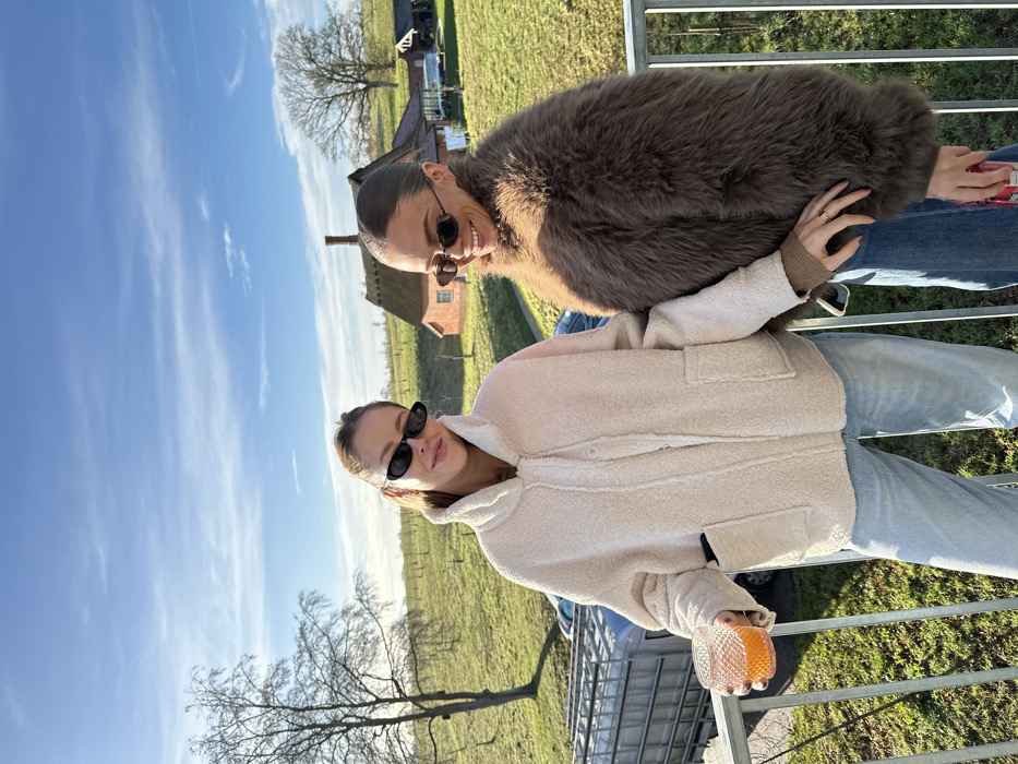 The image displays two adult females on an elevated outdoor platform, overlooking a rural landscape identified as East Suffolk, United Kingdom. The scene is illuminated by daylight under a blue sky with sparse clouds. The woman on the left wears a cream-colored, textured, high-collared jacket and light blue jeans, with black oval sunglasses on her face, and holds a clear, textured glass containing an orange liquid in her left hand. She presents a slight smile while looking towards the viewer. The woman on the right wears a dark brown, shaggy faux fur coat and light blue jeans, with dark oval sunglasses. She exhibits a broad smile, looking to her left, with her left hand positioned near the waist of the other woman. A grey metal railing occupies the lower foreground. The background consists of expansive green fields dotted with bare deciduous trees and a prominent red-brick building featuring a thatched roof and chimney. A light-colored vehicle equipped with a roof rack is partially visible in the mid-ground behind the left subject.