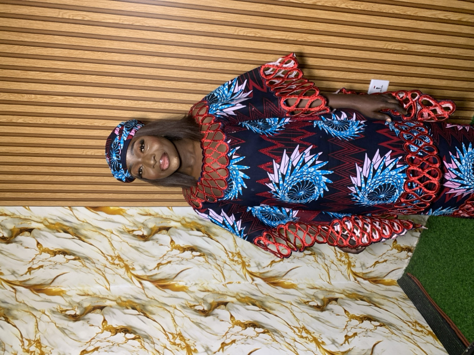 A full-length portrait shows an adult female standing indoors. She has dark skin, shoulder-length dark hair, and faces slightly right, looking at the camera with a slight smile. She wears a matching headwrap and a long garment, primarily dark blue, patterned with light blue and pink starburst shapes and red zigzag lines. The garment features red cutwork embroidery with scalloped edges and interlocking patterns on the neckline, bell-shaped sleeve cuffs, and a lower horizontal band. Her right hand is visible. The background is composed of two distinct wall coverings: the left section displays light-colored wallpaper with abstract golden-brown flowing designs, and the right section is paneled with vertical light-brown wooden slats. A patch of green artificial turf is visible on the floor in the lower-left. The specific city location of Jos, Nigeria, is not discernable from the visual information within this image.