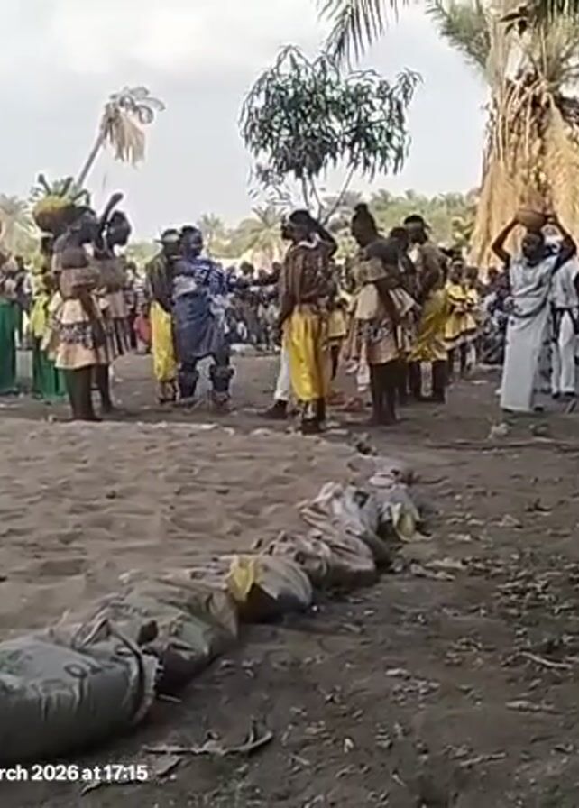A video shows a cultural performance taking place outdoors on a sandy ground. There are several performers lined up in a row, some wearing colorful costumes and carrying objects on their heads. There are also people dressed in white robes. A group of spectators are gathered in the background. In the foreground, a line of what appears to be bags are arranged on the ground. Palm trees and other vegetation surround the scene. The video includes the date and time of filming as well as the phone model. The people in the video appear to be dancing and celebrating, while the spectators watch the event.