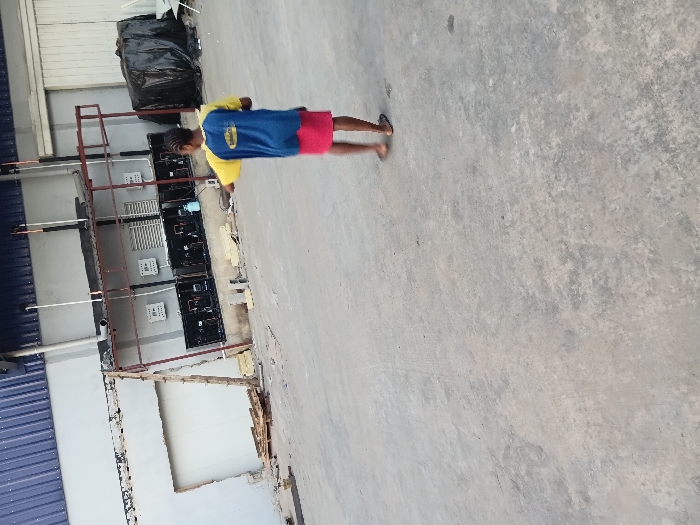 A young person stands on a concrete surface wearing a yellow and blue shirt and pink shorts. They are facing away from the camera. To their left is a building with a blue corrugated metal roof. The building has a series of electrical panels mounted to the wall, connected by metal framing. A large black plastic bag is nearby.