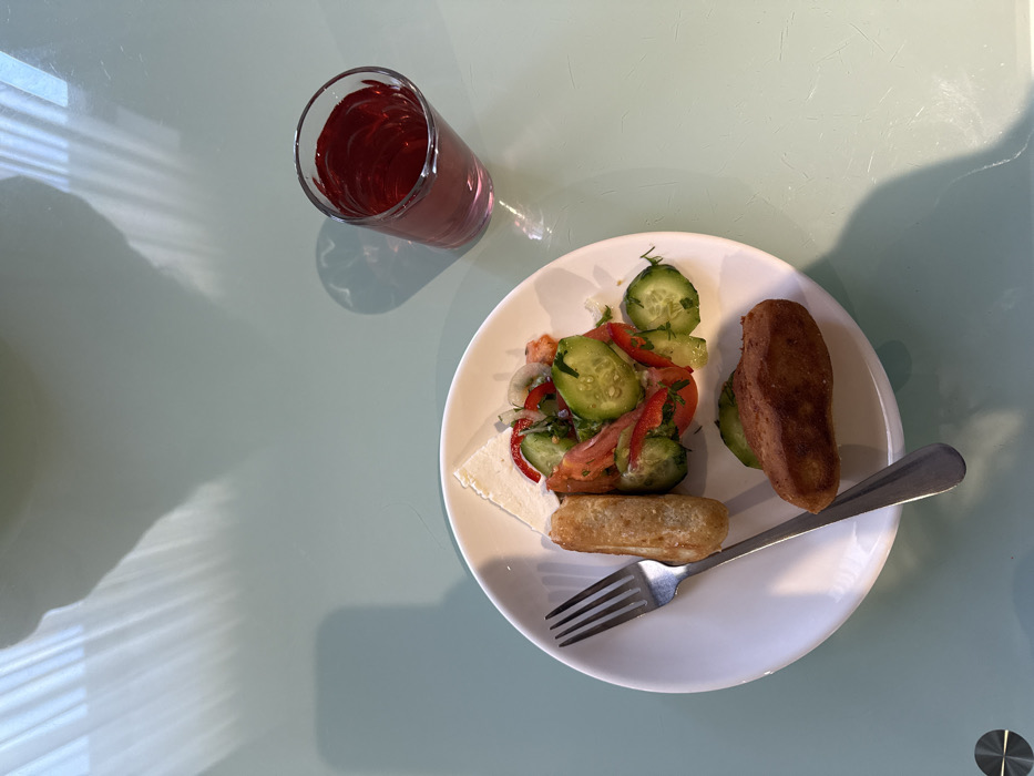 The image displays a meal set on a light green tabletop in Bakuriani, Georgia. A white circular plate, positioned in the lower left quadrant, holds various food items. On the plate, a triangular slice of white cheese is visible, alongside a fresh salad composed of sliced cucumbers, tomatoes, red bell pepper strips, and chopped green herbs. Two fried food items are also present: one is a cylindrical shape, and the other is an oblong, flatter shape. A silver-colored four-tined fork rests on the left side of the plate. To the upper right of the plate, a clear glass contains a reddish-purple liquid. The tabletop exhibits reflections of vertical window blinds or slats originating from the upper left. Shadows of the plate, the glass, and an indistinct, larger overhead object or person are cast on the table surface. No individuals are visible in the scene.