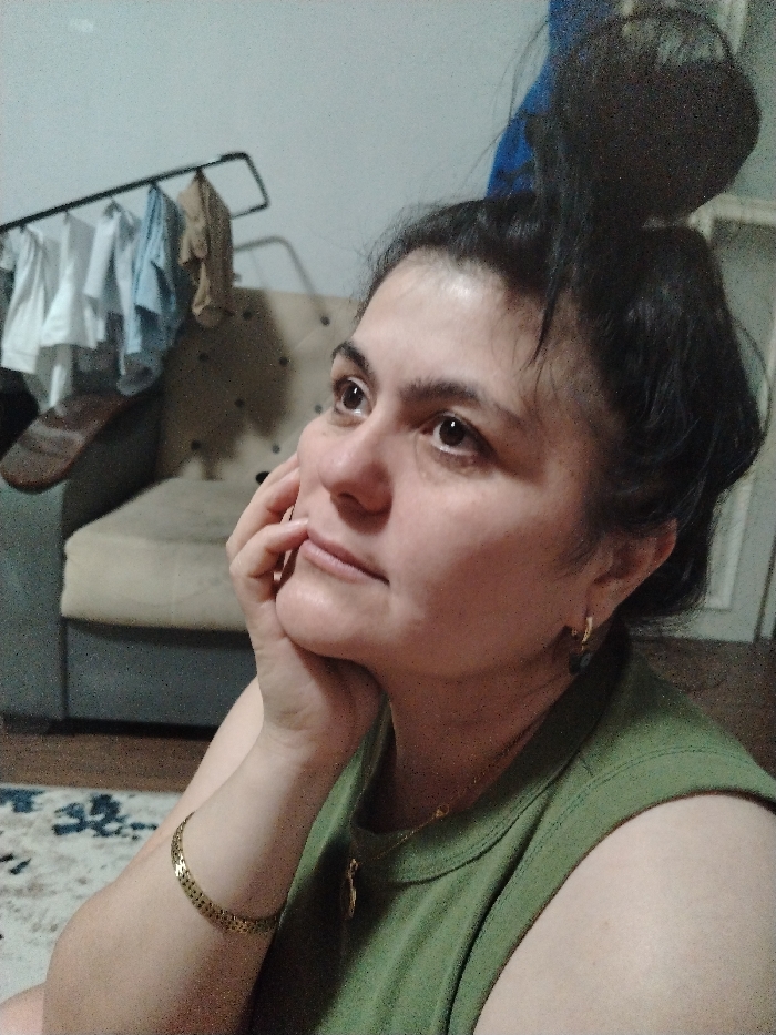 A woman with dark hair in a high bun rests her chin on her hand, looking upwards with a thoughtful expression. She wears a green sleeveless top and gold jewelry, including a necklace and bracelet. Behind her is a sofa and a drying rack with clothes. The lighting is soft and diffuse, casting a gentle glow on her face. The background is slightly cluttered, suggesting a casual, domestic setting.