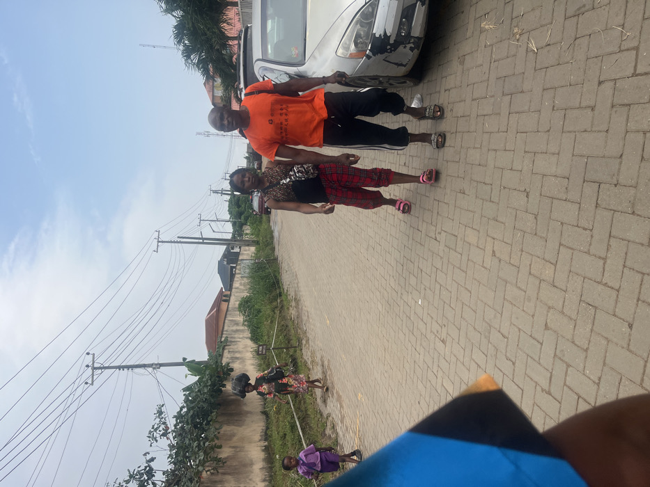 The scene depicts a daylight residential street in Idimu, Nigeria, paved with light-colored interlocking blocks arranged in a herringbone pattern. The sky is overcast. In the mid-ground, a male and a female are walking towards the camera. The male, with dark complexion, wears an orange t-shirt with a white graphic, black capri pants with white side stripes, and dark slide sandals. He carries a dark bag. The female, also with dark complexion, walks to his left, wearing a dark sleeveless top, red and black plaid capri pants, and pink slide sandals. She has a white fanny pack across her chest. Both are looking generally forward. To the left, a female adult is walking away from the camera, carrying a large, dark, possibly fabric-wrapped bundle on her head and a dark shoulder bag. She wears a floral patterned dress. Ahead of her, a young child, dressed in a purple shirt and shorts, walks away from the camera. A silver Honda Accord sedan, showing front bumper damage, is parked on the right side of the road, facing away. Other vehicles are partially visible further down the street. Utility poles with numerous overhead wires line the road. On the left, a light-colored concrete wall topped with dense green foliage runs along the street, with overgrown grass and a small sign (partially obscured, possibly "PARKING") in front of it. Residential buildings with orange-tiled roofs are visible in the background. A partial view of a person's arm, wearing a blue and black striped shirt, is visible in the immediate foreground on the left.