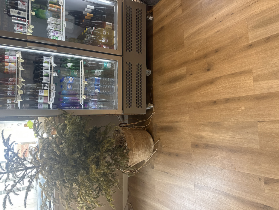 The image depicts an indoor scene within a commercial establishment in Ericeira, Portugal, likely a cafe or shop. The flooring is composed of light brown wood-effect laminate planks. To the left, a medium-sized, somewhat dry evergreen plant, possibly a conifer, is contained within a woven light-brown jute or wicker basket, from which several loose fibers extend onto the floor. Behind the plant, a large window reveals a partial view of an exterior street scene, including a light-colored building facade and a distant, indistinct figure. To the right of the plant, two grey, commercial glass-front display refrigerators stand side-by-side on wheels. The refrigerators are stocked with various bottled and canned beverages, including "MAI MAI" kombucha, "why not" branded drinks, "GoodOds" drinks, bottled still and sparkling water (e.g., "FOS", "VITALIS"), and various wines and juice cartons. Small white paper labels are taped to the interior shelves of the refrigerators. A light-colored cable runs from behind the plant across the floor towards the refrigerators, and a dark cable is visible near the base of the right refrigerator. No individuals are clearly identifiable in the immediate foreground or midground.