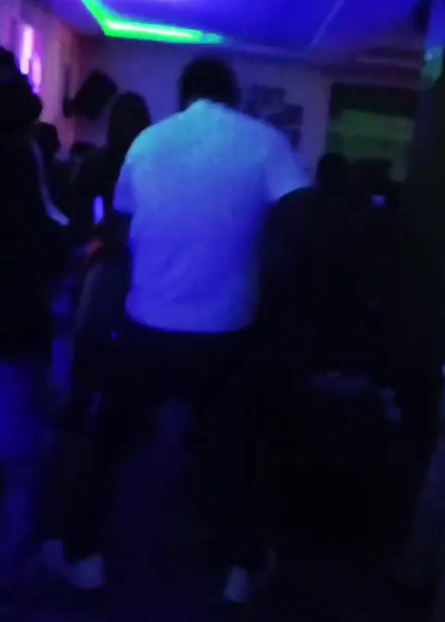 crowded indoor space that appears to be a nightclub or bar. Several people are present, mostly seen from the back. Some are dancing, while others are standing or sitting. The lighting is dark, with heavy use of purple and blue lights and neon accents along the ceiling. A television screen is visible on one wall.
