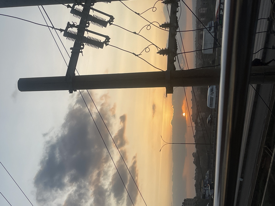 A landscape photograph capturing a sunset through electrical wires and poles. The sky blends hues of yellow and orange where the sun peeks through clouds. Utility poles and power lines crisscross the view, adding a geometric structure against the soft colors. Below the sky, a blurry cityscape hints at a road with moving vehicles. A railing suggests the image was taken from a higher vantage point.