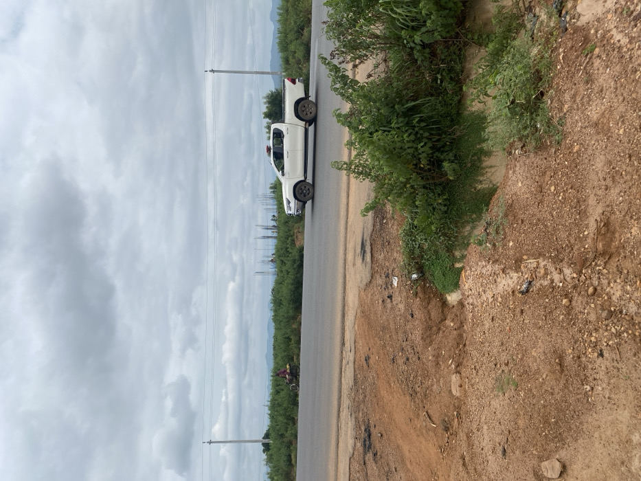 The image captures an outdoor scene on a cloudy day in Abobo, Nigeria. A paved two-lane road horizontally bisects the midground. In the immediate foreground, reddish-brown dirt occupies the lower portion of the frame, showing signs of erosion and containing a shallow gully with some standing water and green vegetation. Scattered debris is visible on the dirt. On the asphalt road, a white four-door pickup truck, equipped with a red light mounted on its roof and dark-colored wheels, is positioned in the right-to-center midground, traveling from right to left. Further to the left on the same road, a lone individual is operating a motorcycle, also moving from right to left. The area beyond the road is characterized by dense green foliage, comprising bushes and taller plants. In the far background, faint outlines of hills are visible beneath the overcast sky, and several vertical structures resembling rebar or unfinished construction elements rise above the distant vegetation. Two grey utility poles supporting overhead power lines are positioned vertically along the road's far side.