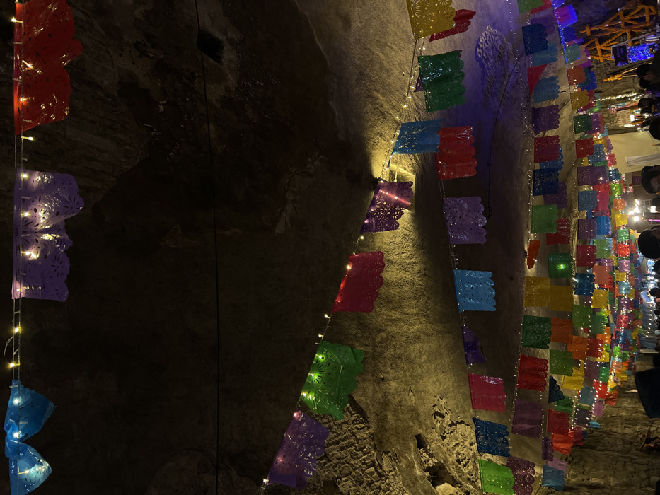 The image captures an interior view of a subterranean venue, likely a cave or rock-hewn tunnel, in an unknown city. The rough, dark, textured rock ceiling and walls are extensively decorated with multiple layers of multi-colored "papel picado" banners. These traditional Mexican perforated paper flags, in shades of blue, purple, red, green, pink, yellow, and orange, display intricate cut-out patterns. Warm-toned LED string lights are interwoven among the banners, providing primary illumination. Additional spotlights cast localized yellow light onto sections of the rock ceiling. In the lower portion of the frame, a dense gathering of people is visible, with only the tops of their heads discernible, indicating a social event. Indistinct structures, including a golden-colored display and a source of blue light, are present within the crowd in the background.