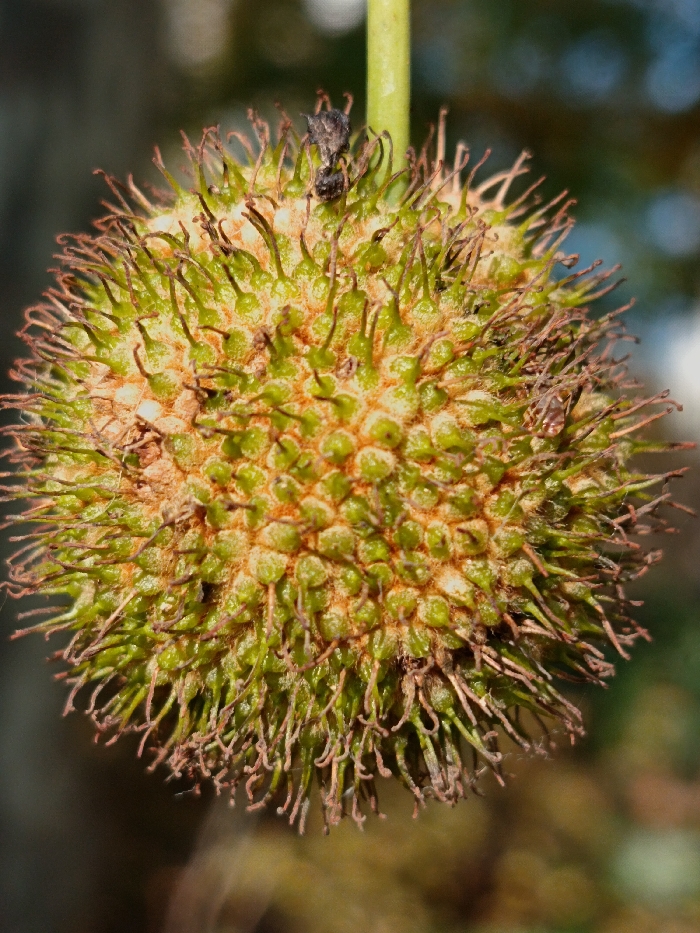 - "A close-up, macro-level photograph captures a spherical, developing fruit of a plane tree (*Platanus* species), commonly known as a sycamore seed ball, suspended from a light green stem in Leipzig, Germany" by FM-rFWs12, licensed under CC BY 4.0